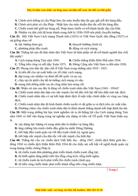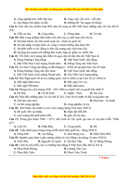 Đây là bản xem th , vu ử i lòng mua tài li u ệ đ xe ể m chi ti t ế (có l i ờ gi i ả ) A. công nghi p ệ hóa, hi n ệ đ i ạ hóa. B. công cu c ộ c i ả cách - m ở c a ử . C. xây d ng ự ch ủ nghĩa xã h i ộ . D. đư ng ờ lối “Ba ng n ọ c ờ h ng” ồ . Câu 9: Giai c p ấ nào chi m ế h n ơ 90% dân số trong xã h i ộ Vi t ệ Nam nh ng ữ năm 20 c a ủ th ế kỉ XX? A. Ti u ể tư s n. ả B. Công nhân. C. Nông nhân. D. Tư sản. Câu 10: M t ộ trong nh ng ữ bi u ể hi n ệ ch ủ y u ế c a ủ xu th ế toàn c u ầ hóa là
