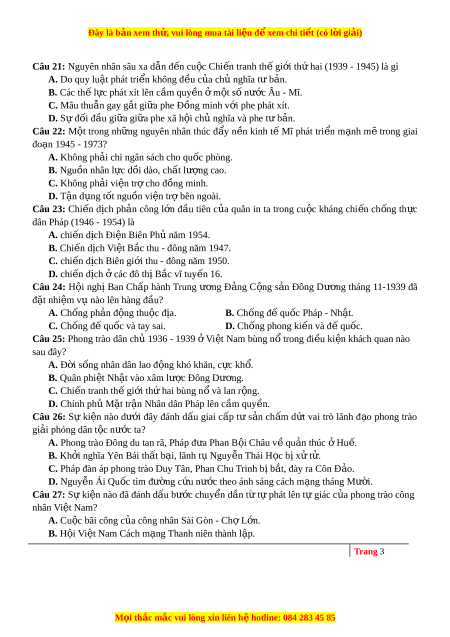 Câu 25: Phong trào dân ch ủ 1936 - 1939 ở Vi t ệ Nam bùng n ổ trong đi u ề ki n ệ khách quan nào sau đây? A. Đ i ờ s ng ố nhân dân lao đ ng ộ khó khăn, c c ự kh . ổ B. Quân phi t ệ Nh t ậ vào xâm lư c ợ Đông Dư ng ơ . C. Chi n ế tranh th ế gi i ớ th ứ hai bùng n ổ và lan r ng. ộ D. Chính ph ủ M t ặ tr n ậ Nhân dân Pháp lên c m ầ quy n ề . Câu 26: Sự ki n ệ nào dư i ớ đây đánh d u ấ giai c p ấ t ư s n ả ch m ấ d t ứ vai trò lãnh đ o ạ phong trào giải phóng dân t c ộ nư c ớ ta?