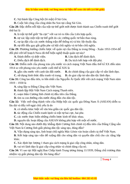 C. Sự thành lập Công h i ộ (bí m t) ậ ở Sài Gòn. D. Cu c ộ bãi công c a ủ công nhân Ba Son t i ạ c ng ả Sài Gòn. Câu 28: Đặc đi m ể nổi bật c a ủ tr t ậ t ự th ế gi i ớ m i ớ đư c ợ hình thành sau Chi n ế tranh th ế gi i ớ thứ hai là A. là trật t ự th ế gi i ớ “đa c c ự ” v i ớ vai trò to l n ớ c a ủ Liên h p ợ qu c ố . B. sự xác l p ậ m t ộ tr t ậ t ự th ế gi i ớ do các cư ng ờ qu c ố t ư b n ả thao túng. C. sự áp đặt c a ủ các nư c ớ th ng ắ tr n ậ đ ể th ng ố tr ị và bóc l t ộ thu c ộ đ a ị .