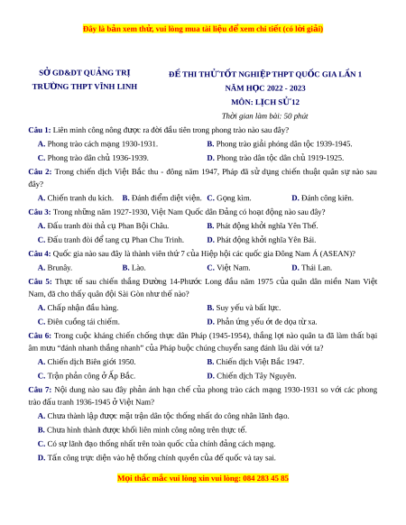 Đề thi thử Lịch sử trường Vĩnh Linh - Quảng Trị lần 1 năm 2023