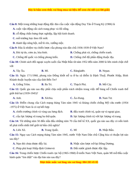 Câu 11: Ngày 17/1/1960, phong trào Đ ng ồ kh i ở nổ ra ở ba xã đi m ể là Đ nh ị Thu , ỷ Phư c ớ Hi p, ệ Bình Khánh thu c ộ huy n nà ệ o c a ủ t nh B ỉ n ế Tre? A. Gi ng ồ Trôm. B. Ba Tri. C. Thạch Phú. D. M Cà ỏ y. Câu 12: Qu c ố gia nào sau đây ph i ả ch u ị m t ộ ph n ầ trách nhi m ệ trong vi c ệ để bùng nổ Chi n ế tranh thế gi i ớ th ha ứ i (1939-1945)? A. Anh. B. Xécbia. C. Áo-Hung. D. Nam T . ư Câu 13: Đi m ể chung c a ủ Cách m ng