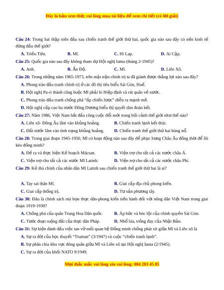 Đây là bản xem th , vu ử i lòng mua tài li u ệ đ xe ể m chi ti t ế (có l i ờ gi i ả ) Câu 24: Trong hai th p ậ niên đ u ầ sau chi n ế tranh thế gi i ớ thứ hai, qu c ố gia nào sau đây có n n ề kinh tế đ ng đ ứ ầu thế gi i ớ ? A. Triều Tiên. B. Mĩ. C. Hi Lap. D. Ai Cập. Câu 25: Qu c