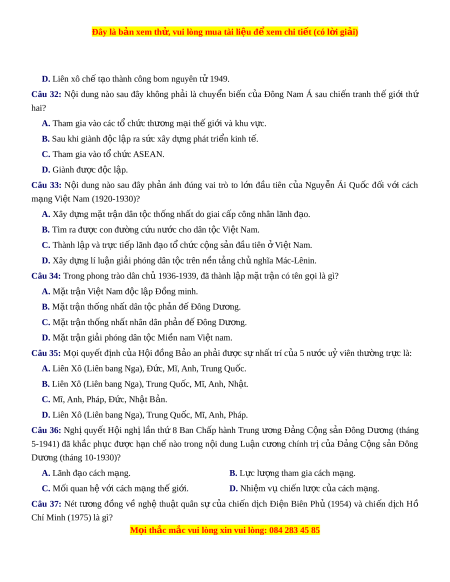 Câu 30: Đâu là chính sách mà b n ọ th c ự dân-phong ki n ế ti n ế hành đ i ố v i ớ nông dân Vi t ệ Nam trong giai đoạn 1919-1930? A. Ch ng ố phá c a ủ quân Trung Hoa Dân qu c ố . B. Áp b c ứ và bóc l t ộ c a ủ chính quy n S ề ài Gòn. C. Tư c ớ đoạt ru ng ộ đất c a ủ th c ự dân Pháp. D. Nhổ lúa, tr ng ồ đay c a ủ Nhật B n. ả Câu 31: S ki ự n ệ đánh dấu vi c ệ tan v m ỡ i ố quan h Đ ệ ng m ồ inh ch ng ố phát xít gi a ữ Mĩ và Liên xô là A. S ra ự đ i ờ c a ủ h c ọ thuy t