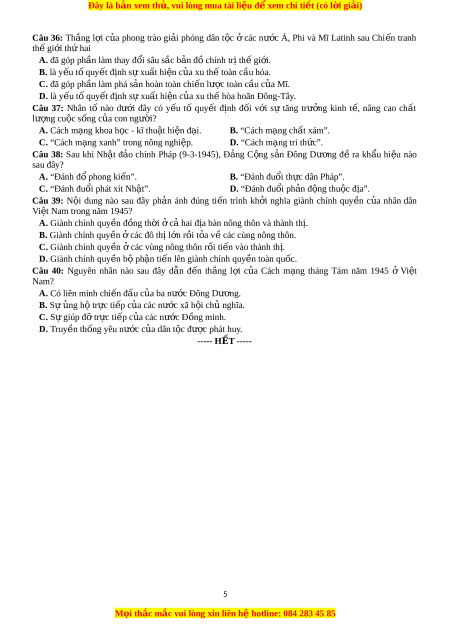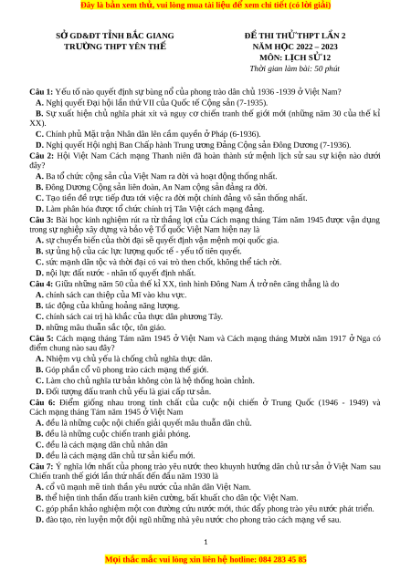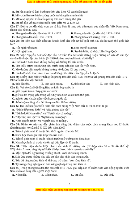 D. Phong trào cách mạng 1930 - 1931. Câu 28: Sự ki n ệ nào kh i ở đ u ầ t o ạ khuôn khổ c a ủ tr t ậ tự thế gi i ớ m i ớ sau chi n ế tranh thế gi i ớ thứ hai? A. H i ộ ngh P ị t ố xđam. B. H c ọ thuyết Macsan. C. H i ộ ngh Ia ị nta. D. S t ự hành lập tổ ch c ứ Liên H p Q ợ u c ố . Câu 29: Vi c ệ Nguy n ễ Ái Qu c ố đ c ọ b n ả Sơ th o ả l n ầ thứ nh t ấ nh ng ữ Lu n ậ cư ng ơ v ề v n ấ đ ề dân t c ộ và vấn đề thu c ộ đ a ị c a