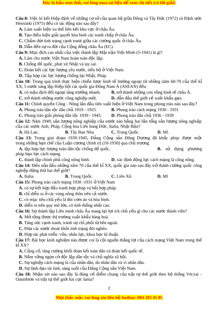 ế hòa bình các tranh chấp c ở hâu Âu. C. Chấm d t ứ tình tr ng c ạ nh t ạ ranh gi a ữ các cư ng ờ qu c ố c ở hâu Âu. D. Dẫn đến s ra ự đ i ờ c a ủ C ng ộ đ ng c ồ hâu Âu (EC). Câu 9: M c ụ đích cao nhất c a ủ vi c ệ thành l p M ậ t ặ tr n ậ Vi t ệ Minh (5-1941) là gì? A. Làm cho nư c ớ Vi t ệ Nam hoàn toàn đ c ộ l p. ậ B. Ch ng ố đ qu ế c ố , phát xít Nh t ậ và tay sai.