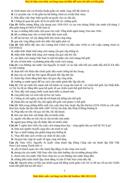ở nghĩa tháng Tám năm 1945. B. đề ra nh ng ữ m c ụ tiêu và hình th c ứ đấu tranh m i ớ . C. để lại bài h c ọ v xâ ề y d ng kh ự i ố liên minh công nông D. góp s c ứ cùng đ ng ồ minh tiêu di t ệ ch nghĩ ủ a phát xít. Câu 20: M t ộ đi m ể đ c ộ đáo c a ủ Cư ng ơ lĩnh Chính trị (đ u ầ năm 1930) so v i ớ Lu n ậ cư ng ơ chính trị (10/1930) là A. nhận th c ứ đư c