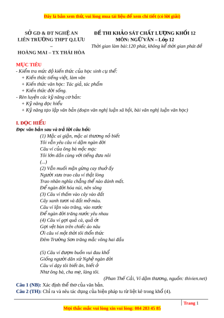 SỞ GD & ĐT NGHỆ AN Đ Ề THI KH O Ả SÁT CH T Ấ LƯ NG Ợ KH I Ố 12 LIÊN TRƯ NG Ờ THPT Q.L U Ư MÔN: NG Ữ VĂN – L p ớ 12 – Th i