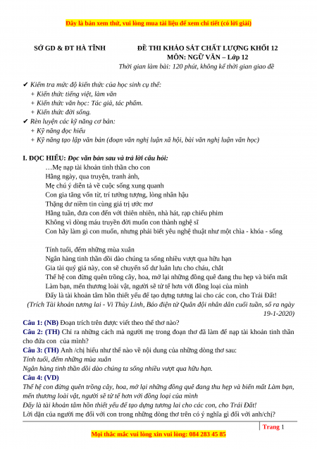 Đề thi thử Ngữ văn Sở Hà Tĩnh lần 1 năm 2023