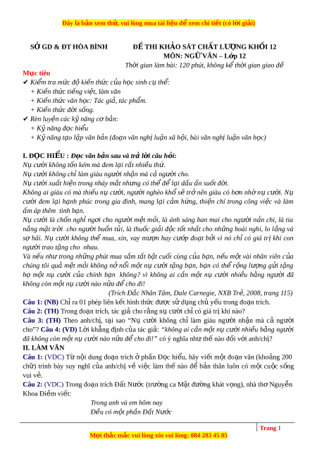 Ở GD & ĐT HÒA BÌNH Đ Ề THI KH O Ả SÁT CH T Ấ LƯ NG Ợ KH I Ố 12 MÔN: NG Ữ VĂN – L p ớ 12 Th i