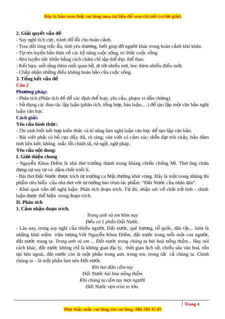ế không mắc lỗi chính t , ả t ừ ng , ữ ng ữ pháp. Yêu c u ầ n i ộ dung: I. Giới thi u ệ chung - Nguy n ễ Khoa Đi m ề là nhà thơ trư ng ở thành trong kháng chi n ế ch ng ố Mĩ. Thơ ông ch a ứ đựng s ự suy t ư và dậm ch t ấ tri t ế lí. - Bài th ơ Đ t ấ Nư c ớ đư c ợ trích t ừ trư ng ờ ca M t ặ đư ng ờ khát v ng. ọ Đây là m t ộ trong nhũng thi phẩm tiêu bi u ể c a ủ nhà th ơ v i ớ t ư tư ng ở bào trùm tác ph m: ẩ “Đ t ấ Nư c ớ c a ủ nhân dân”. - Khái quát v n ấ đề nghị lu n: ậ Phân tích đo n ạ trích. Từ đó, nh n ậ xét về ch t ấ tr ữ tình - chính luận đư c ợ th ể hi n ệ trong đoạn trích. II. Phân tích 1. C m ả nh n ậ đo n ạ trích.
