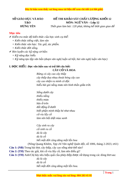 Đây là bản xem th , vu ử i lòng mua tài li u ệ đ xe ể m chi ti t ế (có l i ờ gi i ả ) SỞ GIÁO D C Ụ VÀ ĐÀO Đ Ề THI KH O Ả SÁT CH T Ấ LƯ NG Ợ KH I Ố 12 TẠO MÔN: NG Ữ VĂN – L p ớ 12 H NG Ư YÊN Th i