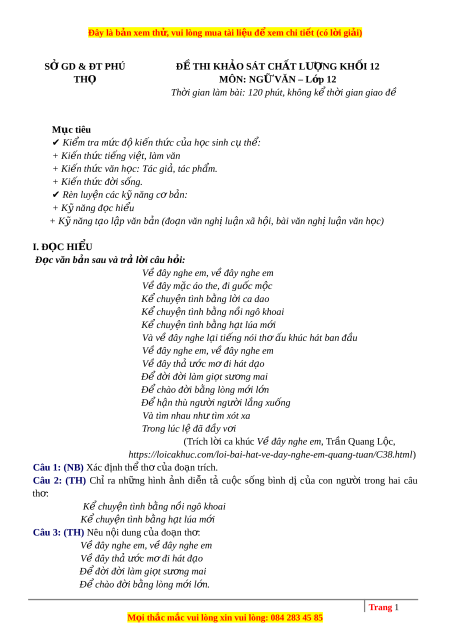 Đây là bản xem th , vu ử i lòng mua tài li u ệ đ xe ể m chi ti t ế (có l i ờ gi i ả ) SỞ GD & ĐT PHÚ Đ Ề THI KH O Ả SÁT CH T Ấ LƯ NG Ợ KH I Ố 12 THỌ MÔN: NG Ữ VĂN – L p ớ 12 Th i