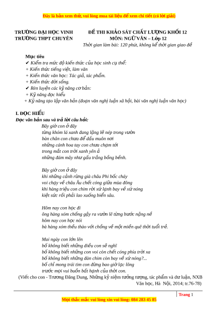 Đây là bản xem th , vu ử i lòng mua tài li u ệ đ xe ể m chi ti t ế (có l i ờ gi i ả ) TRƯ NG Ờ Đ I Ạ H C Ọ VINH Đ Ề THI KH O Ả SÁT CH T Ấ LƯ NG Ợ KH I Ố 12 TRƯ NG Ờ THPT CHUYÊN MÔN: NG Ữ VĂN – L p ớ 12 Th i