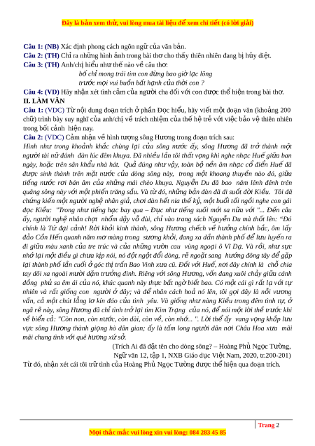Câu 2: (VDC) Cảm nhận v ề hình tư ng ợ sông Hư ng ơ trong đo n ạ trích sau: Hình như trong kho nh ả kh c ắ chùng l i ạ c a ủ sông nư c ớ y ấ , sông Hư ng
