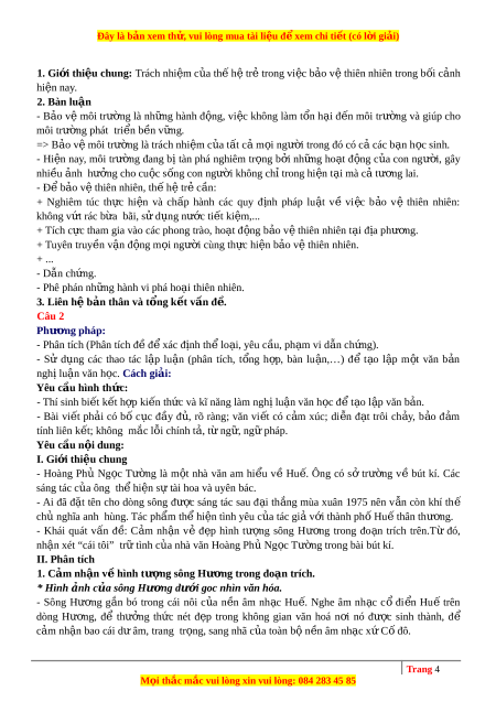 ự tham gia vào các phong trào, ho t ạ đ ng ộ b o ả v ệ thiên nhiên t i ạ đ a ị phư ng. ơ + Tuyên truy n ề v n ậ đ ng ộ m i ọ ngư i ờ cùng th c ự hi n ệ b o ả v ệ thiên nhiên. + ... - Dẫn ch ng ứ . - Phê phán nh ng ữ hành vi phá ho i ạ thiên nhiên. 3. Liên h ệ b n ả thân và t n ổ g k t ế v n ấ đ . ề Câu 2 Phương pháp: