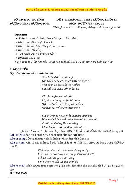 Ở GD & ĐT HÀ TĨNH Đ Ề THI KH O Ả SÁT CH T Ấ LƯ NG Ợ KH I Ố 12 TRƯ NG Ờ THPT HƯ NG Ơ KHÊ MÔN: NG Ữ VĂN – L p ớ 12 Th i