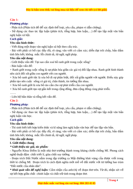 ế không mắc lỗi chính t , ả t ừ ng , ữ ng ữ pháp. Yêu c u ầ n i ộ dung: - Gi i ớ thi u ệ v n ấ đ : ề T i ạ sao c n ầ xoá b ỏ ranh gi i ớ trong cu c ộ s ng ố ? - Bàn luận vấn đ : ề + Ranh gi i ớ trong cu c ộ s ng ố là sự phân hóa gi a ữ các giá tr ịđ i ố l p ậ nhau. Ranh gi i ớ hình thành nên cách đ i ố x ử gi a ữ con ngư i ờ v i ớ con ngư i. ờ + Xóa bỏ ranh gi i ớ t c ứ là xóa b ỏ đi s ự phân bi t ệ , đ i ố x ử gi a ữ ngư i ờ v i ớ ngư i. ờ Đi u ề này góp phần tạo nên cu c ộ s ng ố có giá tr , ị chân thành, tin tư ng ở l n ẫ nhau. + Xóa b ỏ ranh gi i ớ là xóa b ỏ rào c n ả cho s ự phát tri n ể c a ủ con ngư i. ờ + Xóa b ỏ ranh gi i ớ t o ạ s ự g n ắ k t ế trong c ng ộ đ ng ồ , đ a ư c ng ộ đ ng ồ cùng phát tri n. ể …… - Liên h ệ bản thân và t ng ổ k t ế v n ấ đ . ề Câu 2: Phương pháp:
