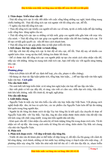 Đây là bản xem th , vu ử i lòng mua tài li u ệ đ xe ể m chi ti t ế (có l i ờ gi i ả ) 2. Thân đo n ạ : Tri n ể khai v n ấ đề - Thái độ s ng ố tích c c ự là vi c ệ đ i ố di n ệ v i ớ cu c ộ s ng ố b ng ằ nh ng ữ suy nghĩ, hành đ ng ộ mang chi u ề hư ng ớ tốt. Thái đ ộ sống tích c c ự trái ngư c ợ v i ớ l i ố s ng ố tiêu c c ự , đ ổ l i ỗ .3 - Ý nghĩa c a ủ thái đ ộ s ng ố tích c c ự : + Tháo độ sống tích c c ự khi n ế con ngư i ờ tr ở nên vui v ẻ h n ơ , t ự đó có đi u ề ki n ệ đ ể t n ậ hư ng ớ cu c ộ s ng ố theo đúng nghĩa c a ủ nó. + Thái độ s ng ố tích c c ự t o ạ ra nh ng ữ cơ h i ộ m i, ớ giúp con ngư i ờ ti n ế g n ầ h n ơ v i ớ m c ụ tiêu c a ủ mình. + Thái độ s ng ố tích c c ự giúp con ngư i ờ nhìn nh n ậ v n ấ đ ề theo hư ng ớ tích c c ự . Từ đó tạo c ơ h i ộ gi i ả quy t ế các vấn đ ề theo cách nhanh h n. ơ + Thái độ s ng ố tích c c ự góp ph n ầ đ a ư xã h i ộ phát tri n ể t t ố h n ơ . 3. K t ế đo n ạ : Bài h c ọ nh n ậ th c ứ và hành đ n ộ g - Đố lập v i ớ thái độ s ng ố tích c c