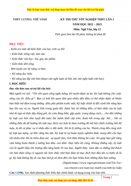 Đề thi thử Ngữ văn trường Lương Thế Vinh lần 2 năm 2023