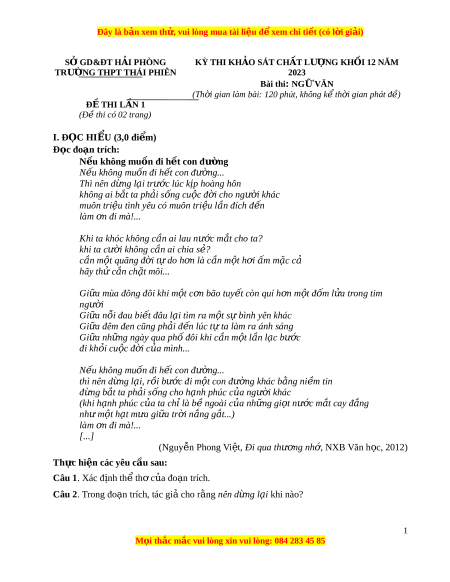 Đây là bản xem th , vu ử i lòng mua tài li u ệ đ xe ể m chi ti t ế (có l i ờ gi i ả ) SỞ GD&ĐT H I Ả PHÒNG KỲ THI KH O Ả SÁT CH T Ấ LƯ N Ợ G KH I Ố 12 NĂM TRƯ N Ờ G THPT THÁI PHIÊN 2023 Bài thi: NGỮ VĂN (Th i