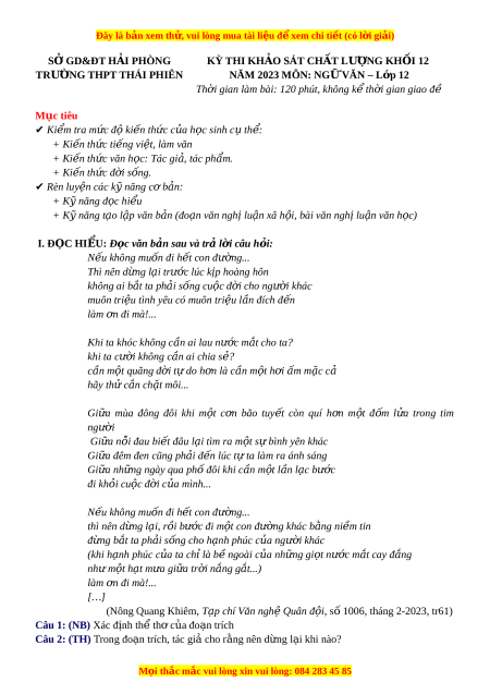 Đây là bản xem th , vu ử i lòng mua tài li u ệ đ xe ể m chi ti t ế (có l i ờ gi i ả ) S Ở GD&ĐT H I Ả PHÒNG KỲ THI KH O Ả SÁT CH T Ấ LƯ NG Ợ KH I Ố 12 TRƯ NG Ờ THPT THÁI PHIÊN NĂM 2023 MÔN: NG Ữ VĂN – L p ớ 12 Th i
