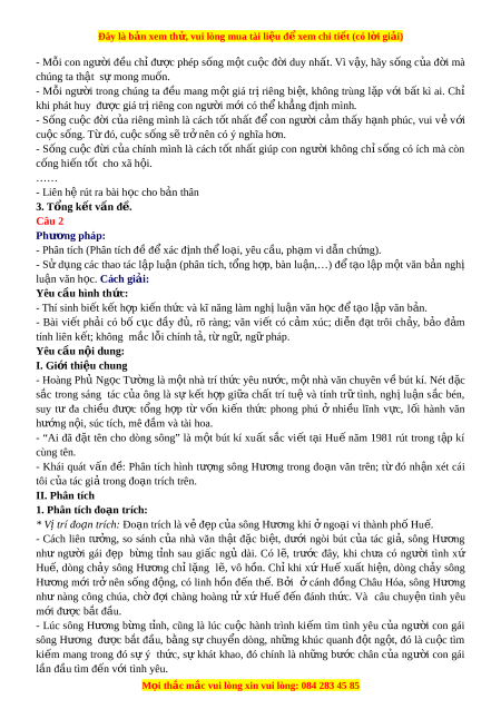 ợ giá trị riêng con ngư i ờ m i ớ có th ể kh ng ẳ đ nh ị mình. - Sống cu c ộ đ i ờ c a ủ riêng mình là cách t t ố nh t ấ đ ể con ngư i ờ c m ả th y ấ h nh ạ phúc, vui v ẻ v i ớ cu c ộ sống. T ừ đó, cu c ộ s ng ố s ẽ tr ở nên có ý nghĩa h n. ơ - Sống cu c ộ đ i ừ c a ủ chính mình là cách t t ố nh t ấ giúp con ngư i ờ không ch ỉs ng ố có ích mà còn cống hi n ế tốt cho xã h i. ộ …… - Liên h ệ rút ra bài h c ọ cho b n ả thân 3. Tổng k t ế v n ấ đ . ề Câu 2 Phương pháp: