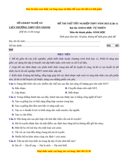 SỞ GD&ĐT NGHỆ AN Đ Ề THI TH Ử T T Ố NGHI P Ệ THPT NĂM 2023 (L n ầ 1) LIÊN TRƯ N Ờ G THPT YÊN THÀNH Bài thi: KHOA H C Ọ T N Ự HIÊN