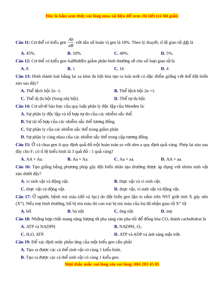Đây là bản xem th , vu ử i lòng mua tài li u ệ đ xe ể m chi ti t ế (có l i ờ gi i ả ) Ab Câu 11: C t ơ hể có kiểu gen v i ớ tần s hoá ố n v ge ị n là 10%. Theo lý thuy t ế , tỉ l gi ệ ao t ử AB là aB A. 45%. B. 10%. C. 40%. D. 5%.