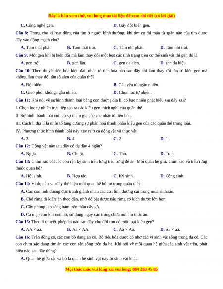Câu 9: Một gen khi bị biến đổi mà làm thay đổi một loạt các tính trạng trên cơ thể sinh vật thì gen đó là A. gen trội. B. gen lặn. C. gen da alen. D. gen đa hiệu.
