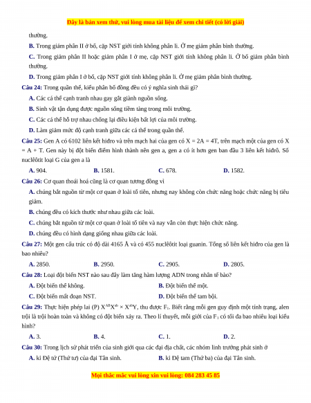 Câu 27: Một gen cấu trúc có độ dài 4165 Å và có 455 nuclêôtit loại guanin. Tổng số liên kết hiđro của gen là