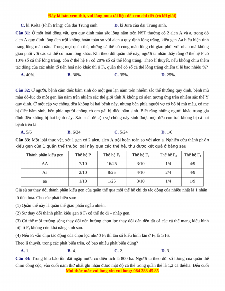 Câu 31: Ở một loài động vật, gen quy định màu sắc lông nằm trên NST thường có 2 alen A và a, trong đó