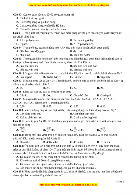 Câu 95: Theo quan điểm học thuyết tiến hóa tổng hợp hiện đại, giai đoạn hình thành nên tế bào sơ