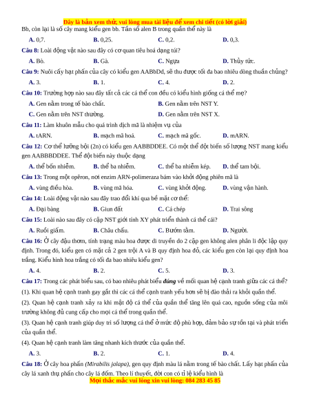 Đây là bản xem th , vu ử i lòng mua tài li u ệ đ xe ể m chi ti t ế (có l i ờ gi i ả ) Bb, còn lại là s c ố ây mang ki u ge ể n bb. Tần s a ố len B trong quần th nà ể y là A. 0,7. B. 0,25. C. 0,2. D. 0,3. Câu 8: Loài đ ng v ộ