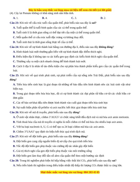 (4). Cây lai Pomato không có kh nă ả ng sinh s n h ả u t ữ ính. A. 1. B. 4. C. 3. D. 2. Câu 23: Khi nói v c ề ấu trúc tu i ổ c a ủ qu n t ầ h , phá ể t bi u nà ể