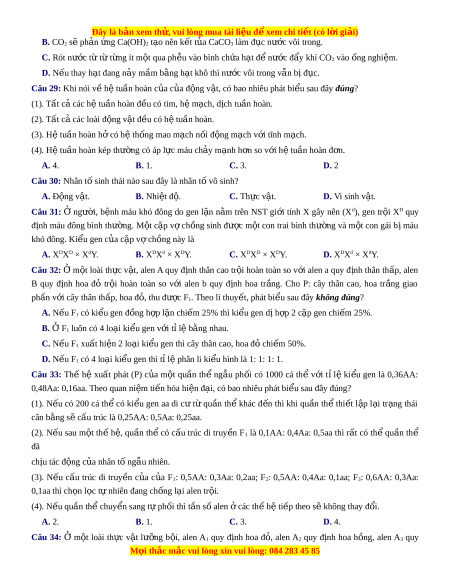 Câu 1: Quá trình nào sau đây tạo ra đ ng ộ l c ự đầu trên c a ủ dòng m c ạ h g ? ỗ A. Hút nư c ớ . B. Áp suất r . ễ C. Quang h p. ợ D. Thoát h i ơ nư c ớ . Câu 2: M t ộ trong nh ng ữ b ng ằ ch ng ứ về sinh h c ọ phân t c ử h ng ứ minh r ng ằ t t ấ c c ả ác loài sinh v t ậ đ u ề có chung ngu n g ồ c ố là A. s t ự ư ng ơ đ ng v ồ quá ề trình phát tri n phôi ể m ở t ộ s l ố oài đ ng v ộ t ậ có xư ng ơ s ng. ố B. s gi ự ng nha ố u v m ề t ộ số đặc đi m ể hình thái gi a ữ các loài phân b ố c ở ác vùng đ a ị lý khác nhau.