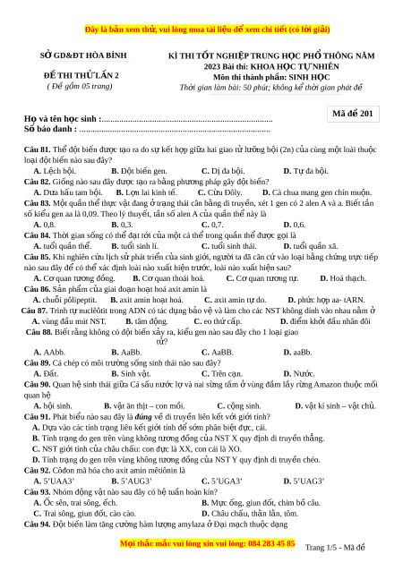 SỞ GD&ĐT HÒA BÌNH KÌ THI TỐT NGHI P Ệ TRUNG H C Ọ PH Ổ THÔNG NĂM 2023 Bài thi: KHOA H C Ọ TỰ NHIÊN Đ Ề THI TH L Ử N Ầ 2 Môn thi thành ph n ầ : SINH HỌC ( Đề g m ồ 05 trang) Th i