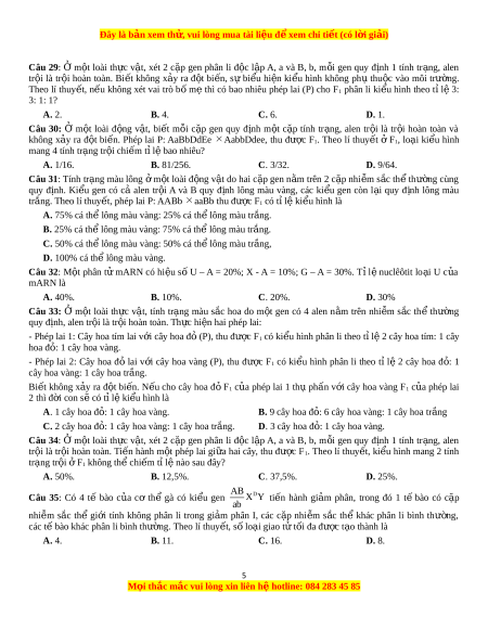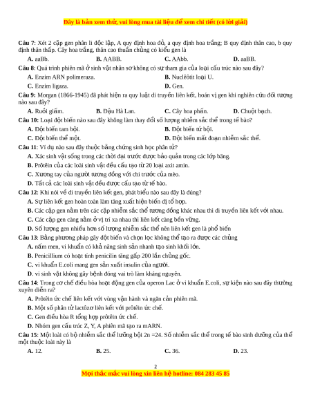 Đây là bản xem th , vu ử i lòng mua tài li u ệ đ xe ể m chi ti t ế (có l i ờ gi i ả ) Câu 7: Xét 2 c p ặ gen phân li đ c ộ l p, ậ A quy đ nh ị hoa đ , ỏ a quy đ nh ị hoa tr ng; ắ B quy đ nh ị thân cao, b quy đ nh