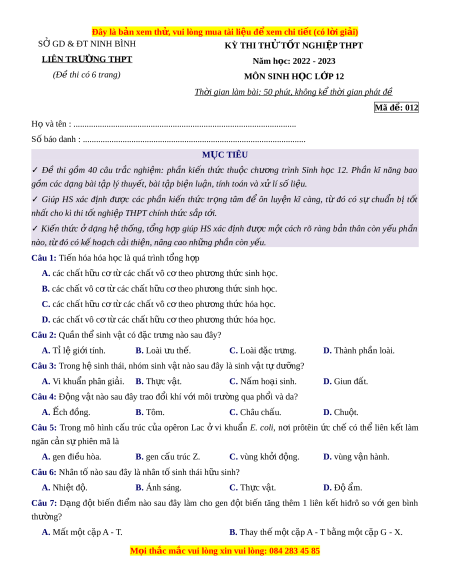 Đây là bản xem th , vu ử i lòng mua tài li u ệ đ xe ể m chi ti t ế (có l i ờ gi i ả ) S G Ở D & ĐT NINH BÌNH KỲ THI TH Ử T T Ố NGHI P Ệ THPT LIÊN TRƯ N Ờ G THPT Năm h c ọ : 2022 - 2023 (Đề thi có 6 trang) MÔN SINH H C Ọ LỚP 12 Th i