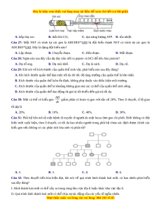Câu 16: Trong quá trình phiên mã, nuclêôtit lo i ạ A c a ủ gen liên k t ế bổ sung v i ớ lo i ạ nuclêôtit nào ở môi trư ng ờ n i ộ bào? A. X. B. U. C. G. D. T. Câu 17: M t ộ quần thể bò g m ồ 65 cá thể có ki u ể gen AA, 26 cá th ể có ki u ể gen Aa và 169 cá th ể có ki u ể gen aa. Theo lí thuy t ế , tần s a ố len a c a