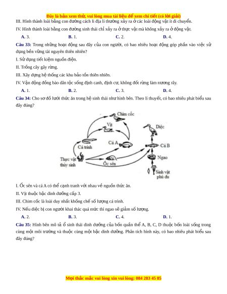 A. Cánh sâu bọ và cánh d i ơ là các cơ quan tư ng ơ đ ng. ồ B. Cánh d i ơ và tay ngư i ờ là c qua ơ n tư ng đ ơ ng. ồ C. Các c qua ơ n tư ng t ơ ự phản ánh s t ự i n hóa ế phân ly. D. Các c qua ơ n tư ng đ ơ ng ồ phản ánh s t ự i n hóa ế đ ng ồ quy. Câu 24: Khi nói v c ề hu i ỗ th c ứ ăn và lư i ớ th c ứ ăn, phát bi u nà ể o sau đây sai? A. Trong lư i ớ th c ứ ăn, m t ộ loài sinh v t ậ có th l ể à m t ắ xích c a ủ nhi u c ề hu i ỗ th c ứ ăn. B. Lư i ớ th c ứ ăn c a ủ qu n ầ xã r ng ừ m a ư nhi t ệ đ i ớ thư ng ờ ph c ứ t p ạ h n ơ lư i ớ th c ứ ăn c a ủ qu n ầ xã th o ả nguyên.