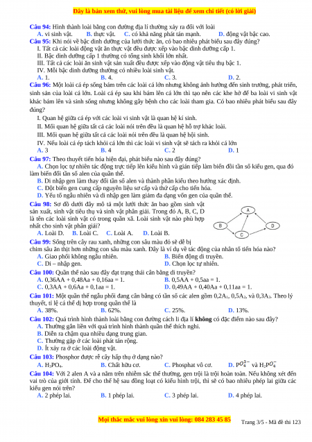 Câu 101: Một quần thể ngẫu phối đang cân bằng có tần số các alen gồm 0,2A1, 0,5A2, và 0,3A3. Theo lý
