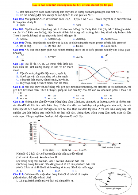 Câu 104: Với 2 alen A và a nằm trên nhiễm sắc thể thường, gen trội là trội hoàn toàn. Nếu không xét đến