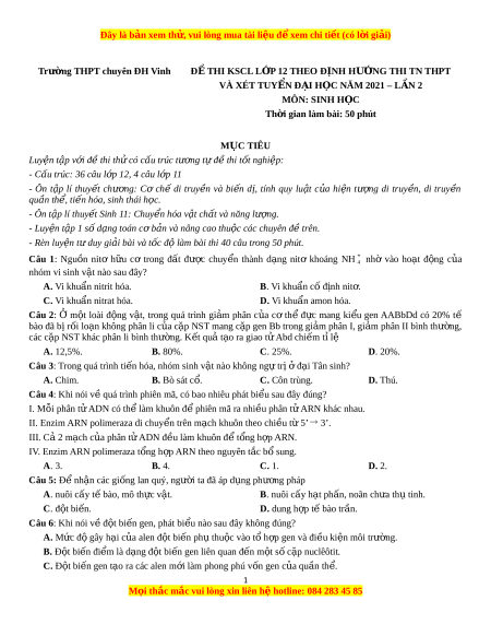 ờ g THPT chuyên ĐH Vinh Đ Ề THI KSCL L P Ớ 12 THEO Đ N Ị H HƯ N Ớ G THI TN THPT VÀ XÉT TUY N Ể Đ I Ạ H C Ọ NĂM 2021 – L N Ầ 2 MÔN: SINH H C Ọ Th i