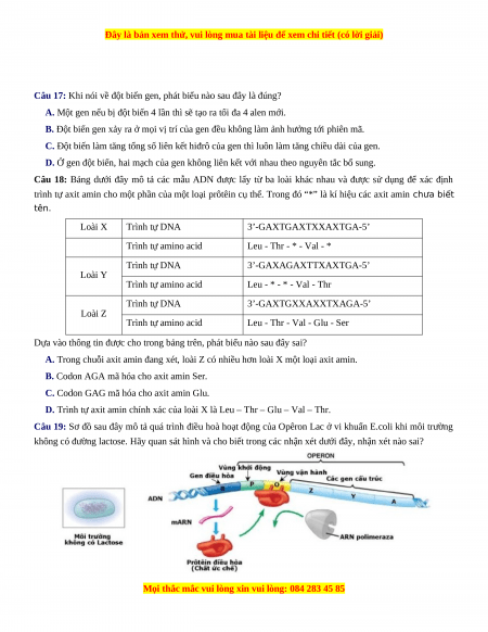 trình tự axit amin cho một phần của một loại prôtêin cụ thể. Trong đó “*” là kí hiệu các axit amin chưa biết tên. Loài X Trình tự DNA 3’-GAXTGAXTXXAXTGA-5’ Trình tự amino acid Leu - Thr - * - Val - * Trình tự DNA 3’-GAXAGAXTTXAXTGA-5’ Loài Y Trình tự amino acid Leu - * - * - Val - Thr Trình tự DNA 3’-GAXTGXXAXXTXAGA-5’ Loài Z Trình tự amino acid Leu - Thr - Val - Glu - Ser