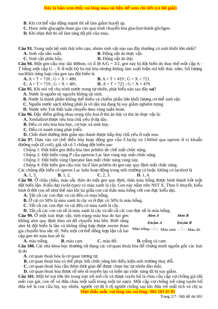 D. Tất cả các con cái sẽ là màu xanh lá cây và tất cả các con đ c ự sẽ là màu h ng ồ . Câu 99. Ở m t ộ loài th c ự v t ậ , tính tr ng ạ màu hoa do hai gen không alen quy đ nh ị theo sơ đồ chuy n ể hóa bên. Bi t ế r ng ằ alen bị đ t ộ bi n ế là l n ặ và không t ng ổ h p ợ đư c ợ enzim tham gia chuy n ể hóa s c ắ t . ố N u ế m t ộ c ơ th ể đ ng ồ h p ợ l n ặ c ả hai cặp gen thì màu hoa s l ẽ à: A. màu trắng. B. màu cam. C. màu đ . ỏ D. trắng và cam.