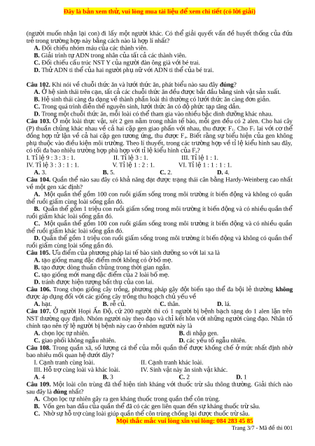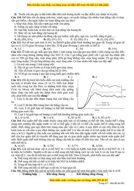 Câu 104. Quần thể nào sau đây có khả năng đ t ạ đư c ợ tr ng ạ thái cân b ng ằ Hardy-Weinberg cao nh t ấ về m t ộ gen xác đ nh? ị A. M t ộ qu n ầ thể g m ồ 100 con ru i ồ gi m ấ s ng ố trong môi trư ng ờ ít bi n ế đ ng ộ và không có qu n ầ thể ru i ồ giấm cùng loài s ng g ố ần đó. B. Quần thể g m ồ 1 tri u ệ con ru i ồ gi m ấ s ng ố trong môi trư ng ờ ít bi n ế đ ng ộ và có nhi u ề qu n ầ thể ru i ồ giấm khác loài s ng g ố ần đó. C. M t ộ qu n ầ thể g m ồ 100 con ru i ồ gi m ấ s ng ố trong môi trư ng ờ ít bi n ế đ ng ộ và có nhi u ề qu n ầ thể ru i ồ giấm khác loài s ng g ố ần đó. D. Quần thể g m ồ 1 tri u ệ con ru i ồ gi m ấ s ng ố trong môi trư ng ờ ít bi n ế đ ng ộ và không có qu n ầ thể ru i ồ giấm cùng loài s ng g ố n đó. ầ Câu 105. u đi Ư ểm c a ủ phư ng phá ơ p lai tế bào sinh dư ng s ỡ o v i ớ lai xa là A. tạo gi ng ố mang đặc đi m ể m i ớ không có b ở ố m . ẹ B. tạo đư c ợ dòng thuần ch ng ủ trong thời gian ngắn. C. tạo gi ng ố m i ớ mang đ c ặ đi m ể c a ủ 2 loài bố m . ẹ D. tránh đư c ợ hi n t ệ ư ng ợ b t ấ th c ụ a ủ con lai. Câu 106. Trong ch n ọ gi ng ố cây tr ng, ồ phư ng ơ pháp gây đ t ộ bi n ế t o ạ thể đa b i ộ lẻ thư ng ờ không đư c ợ áp d ng đ ụ i ố v i ớ các gi ng ố cây tr ng t ồ hu ho c ạ h chủ y u v ế ề A. hạt. B. rễ c . ủ C. thân. D. lá.