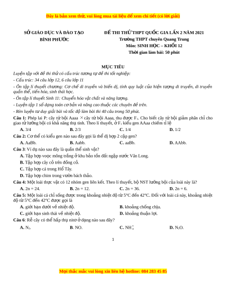 Đề thi thử Sinh Học trường Chuyên Quang Trung lần 2 năm 2021