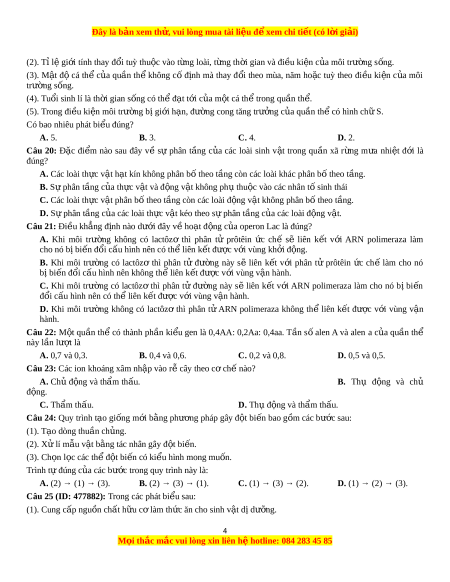 Đây là bản xem th , vu ử i lòng mua tài li u ệ đ xe ể m chi ti t ế (có l i ờ gi i ả ) (2). Tỉ l gi ệ i ớ tính thay đ i ổ tuỳ thu c ộ vào t ng l ừ oài, t ng ừ th i ờ gian và đi u ề ki n c ệ a ủ môi trư ng ờ s ng. ố (3). Mật độ cá thể c a ủ qu n ầ thể không c ố đ nh ị mà thay đ i ổ theo mùa, năm ho c ặ tuỳ theo đi u ề ki n ệ c a ủ môi trư ng ờ s ng. ố (4). Tu i ổ sinh lí là th i ờ gian s ng c ố ó th đ ể t ạ t i ớ c a ủ m t ộ cá th t ể rong qu n t ầ h . ể (5). Trong đi u ki ề n ệ môi trư ng ờ bị gi i ớ h n, đ ạ ư ng ờ cong tăng trư ng ở c a ủ qu n t ầ h c ể ó hình ch S ữ .