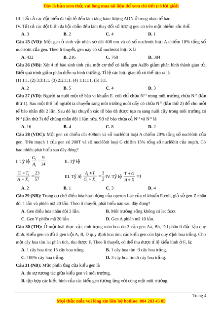 N14 (lần thứ 3) để chúng nhân đôi 1 lần n a ữ . S t ố ế bào ch a ứ cả N14 và N15 là A. 16 B. 4 C. 8 D. 2 Câu 28 (VDC): M t ộ gen có chi u