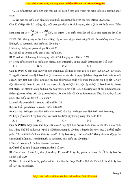 D. 3 cây hoa tím:5 cây hoa trắng. Câu 31 (NB): M c ứ phản ng c ứ a ủ kiểu gen là A. do s t ự ư ng ơ tác gi a ữ ki u ge ể n và môi trư ng. ờ B. tập h p c ợ ác kiểu hình c a ủ các ki u ge ể n tư ng ơ ng ứ v i ớ cùng m t ộ môi trư ng. ờ Trang 4 M i ọ thắc m c